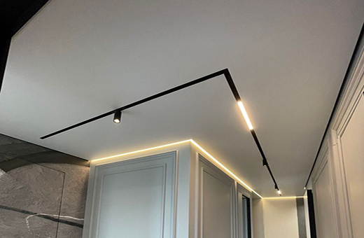 Третьим этапом работы будет установка закладных элементов для будущего освещения в натяжном потолке, точечные светильники, встроенные карнизы, закладные под шкафы-купе, рейки-перегородки, различные световые приборы, световые линии, светодиодная лента, блоки и оборудование для управления освещением.